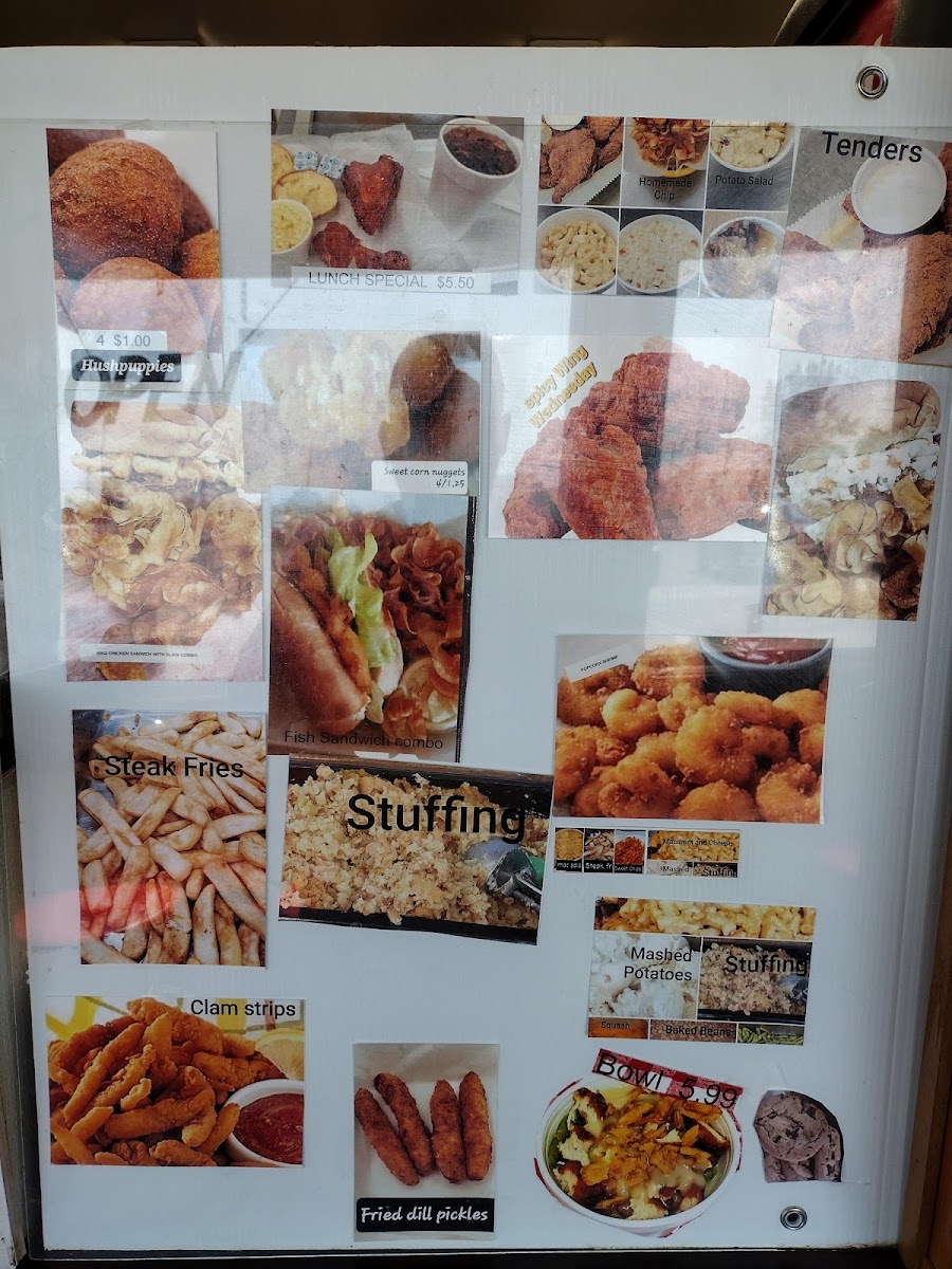 Guests can expect comforting dishes like crispy chicken served with homemade sides such as mac and cheese and stuffing, alongside a variety of seafood options including fish and shrimp dinners. These meals suit a range of occasions—from a quick lunch to a relaxed dinner where the focus is on simple, satisfying food.